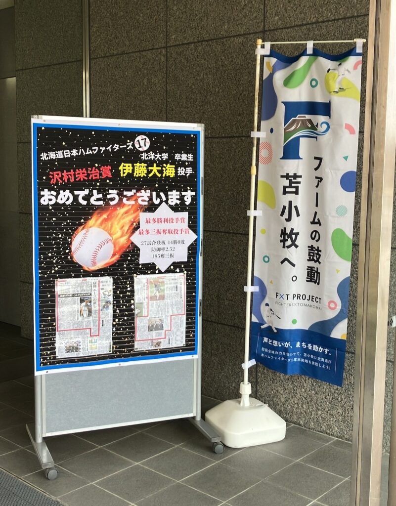 卒業生である北海道日本ハムファイターズ 伊藤大海 投手が沢村賞に選出されたことを記念いたしまして、学内にお祝いのポスターと新聞記事を掲載しております。