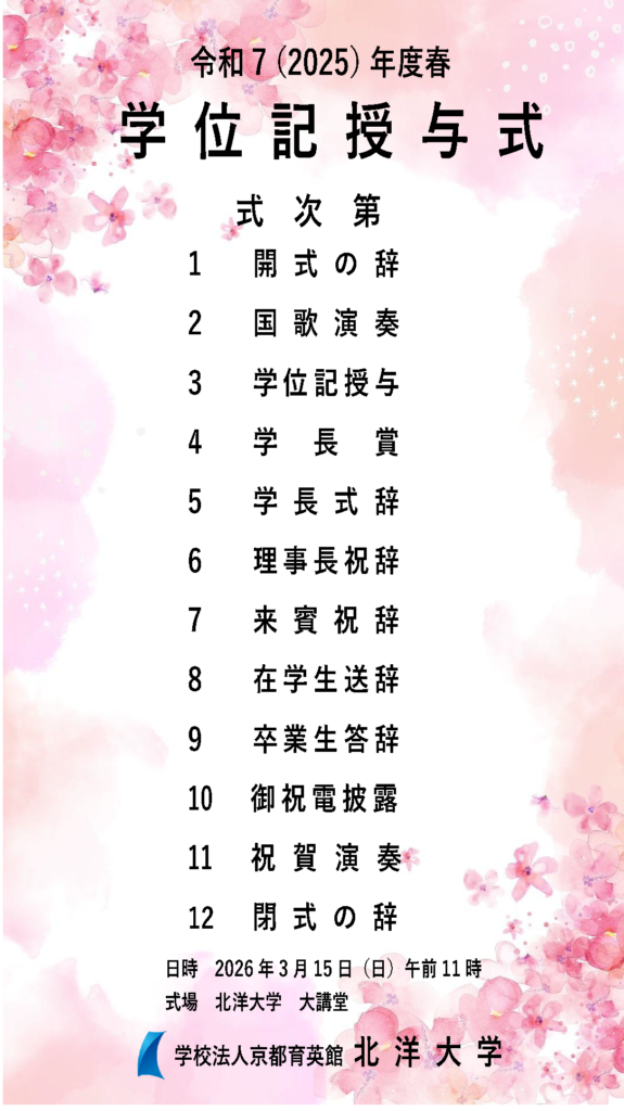 令和7年度春 北洋大学 学位記授与式について 2026-03-04 令和7年度 春 北洋大学 学位記授与式を以下のとおり挙行いたします。 🔹 期 日 : 令和8年3月15日(土) 🔹 開 式 : 午前11時 🔹 式 場 : 北洋大学 大講堂